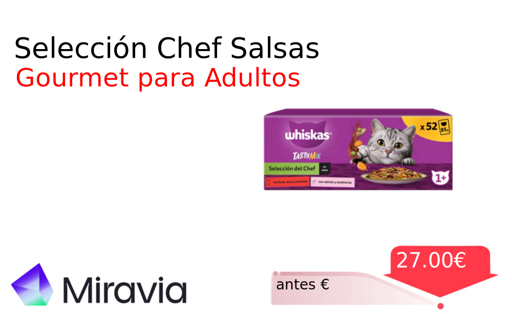 Buen Precio✨ Selección Chef Salsas❗️🆕 #Miravia 📛Precio Ya 27.00€❗️ (PVP: +€) ✨Deliciosa selección gourmet en salsa para gatos adultos Cuatro sabores variados que proporcionan nutrición completa y equilibrada con textura suave. cholloya.com/WHISKAS_TASTY_M