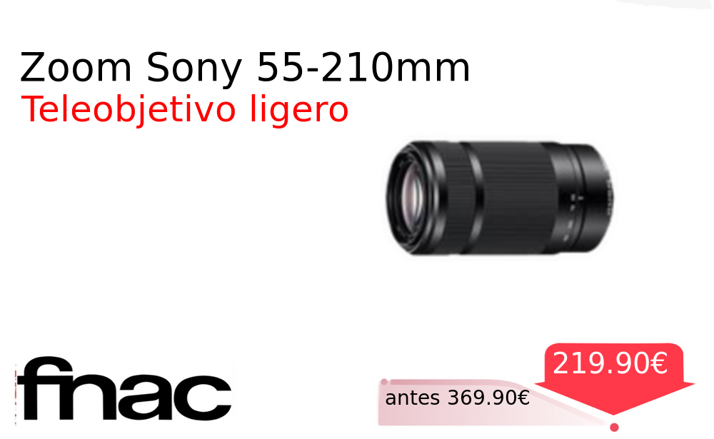 40% 📉 Vaya descuentazo‼‼ Zoom Sony 55-210mm❗️🆕 #fnac 📛Precio Ya 219.90€❗️ (PVP: +369.90€) ✨Objetivo Sony con zoom versátil para fotografías nítidas a distancia Ideal para retratos y paisajes con enfoque automático rápido y construcción ligera. cholloya.com/SONY_55_210MM