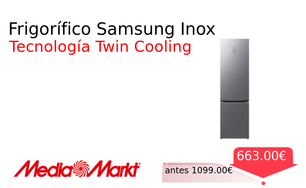 Más de un 30% 🚀 Frigorífico Samsung Inox❗️🆕 #MediaMarkt 📛Precio Ya 663.00€❗️ (PVP: +1099.00€) ✨Frigorífico combi Samsung con tecnología Twin Cooling acabado inoxidable premium y conectividad Wifi Garantiza frescura óptima y control remoto con diseno innovador y funcional. cholloya.com/SAMSUNG_RB38C77