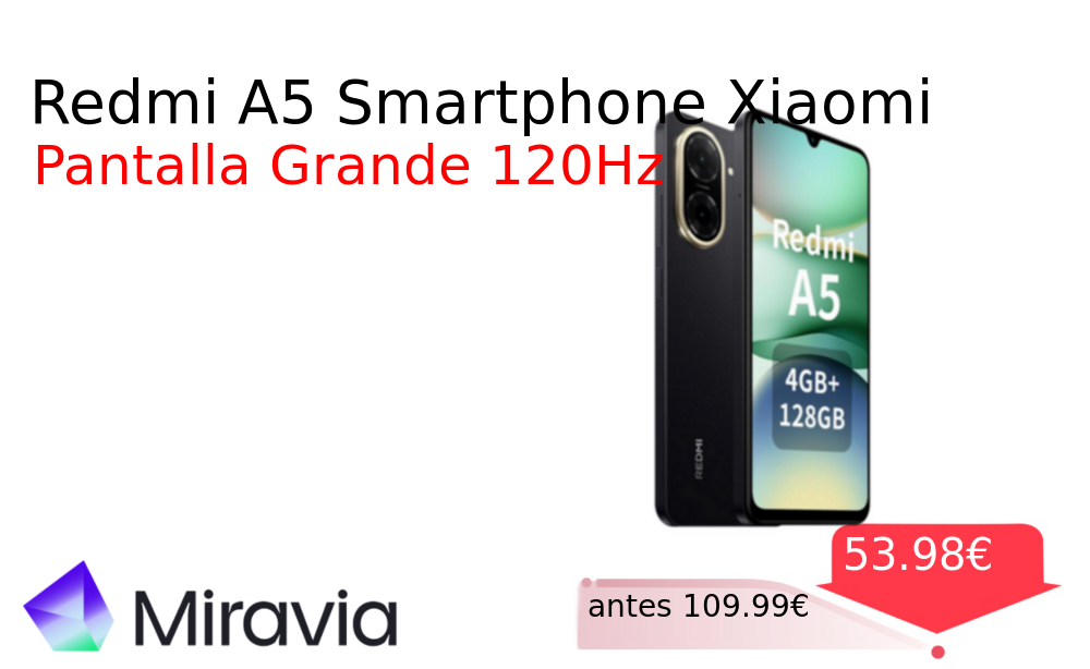 ¡Toma descuento!🤯 Redmi A5 Smartphone Xiaomi❗️🆕 #Miravia 📛Precio Ya 53.98€❗️ (PVP: +109.99€) ✨Smartphone con pantalla inmersiva de 6 88 pulgadas y tasa de refresco de 120 Hz Procesador octa-core y cámara dual AI de 32 megapíxeles. cholloya.com/XIAOMI_REDMI_A5