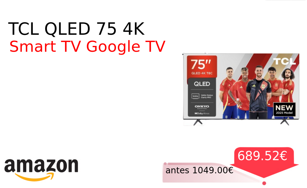 Más de un 30% 🚀 TCL QLED 75 4K❗️🆕 #Amazon 🇪🇸 📛Precio Ya 689.52€❗️ (PVP: +1049.00€) ✨Televisor QLED 75 pulgadas con resolución 4K Ultra HD y tecnología HDR Sonido Onkyo 2 1 envolvente y compatibilidad Google TV integrada para control. cholloya.com/TCL_75T8C_TV