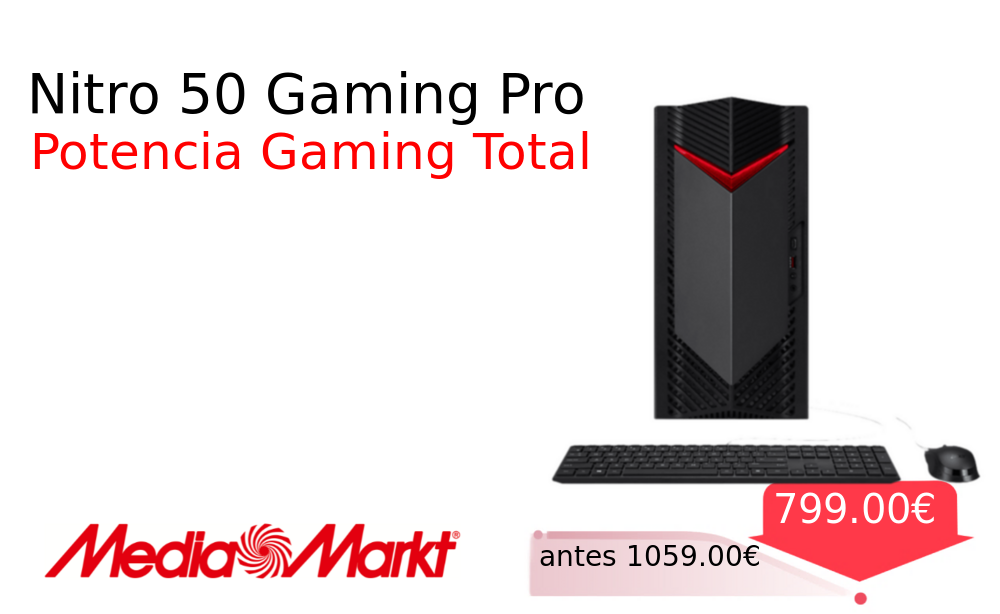 Buen Precio✨ Nitro 50 Gaming Pro❗️🆕 #MediaMarkt 📛Precio Ya 799.00€❗️ (PVP: +1059.00€) ✨Equipo gaming con procesador Intel Core i5 y gráfica Nvidia GeForce RTX Memoria RAM de 16GB y almacenamiento SSD para máxima fluidez en tus. cholloya.com/ACER_NITRO_50