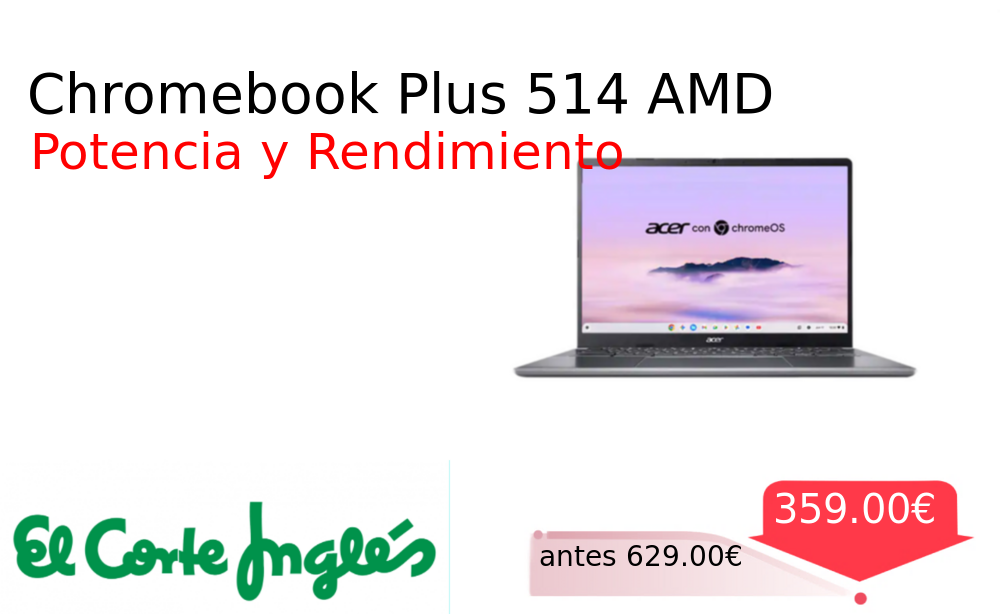 40% 📉 Vaya descuentazo‼‼ Chromebook Plus 514 AMD❗️🆕 #Elcorteingles 📛Precio Ya 359.00€❗️ (PVP: +629.00€) ✨Chromebook Acer con pantalla 14 pulgadas procesador AMD Ryzen y memoria RAM de 16GB Almacenamiento SSD rápido y sistema operativo ChromeOS integrado. cholloya.com/ACER_CHROMEBOOK