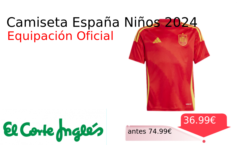 Mitad de precio✂️ Camiseta España Niños 2024❗️🆕 #Elcorteingles 📛Precio Ya 36.99€❗️ (PVP: +74.99€) ✨Camiseta oficial de la selección española para niños Diseño de primera equipación 2024 tecnología adidas Ideal para partidos y entrenamientos. cholloya.com/ESPANA_NINOS_20