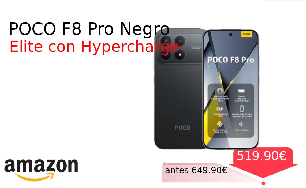 Buen Precio✨ POCO F8 Pro Negro❗️🆕 #Amazon 🇪🇸 📛Precio Ya 519.90€❗️ (PVP: +649.90€) ✨Smartphone con pantalla AMOLED de 120Hz y triple cámara de 50MP con estabilización óptica Procesador Snapdragon Elite y carga rápida de 100W. cholloya.com/POCO_F8_PRO