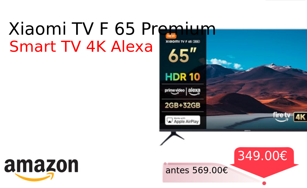 Más de un 30% 🚀 Xiaomi TV F 65 Premium❗️🆕 #Amazon 🇪🇸 📛Precio Ya 349.00€❗️ (PVP: +569.00€) ✨Televisor inteligente de 65 pulgadas con resolución 4K UHD control por voz Alexa y tecnología HDR10 Incluye modo juego optimizado y amplio almacenamiento. cholloya.com/XIAOMI_TV_F65