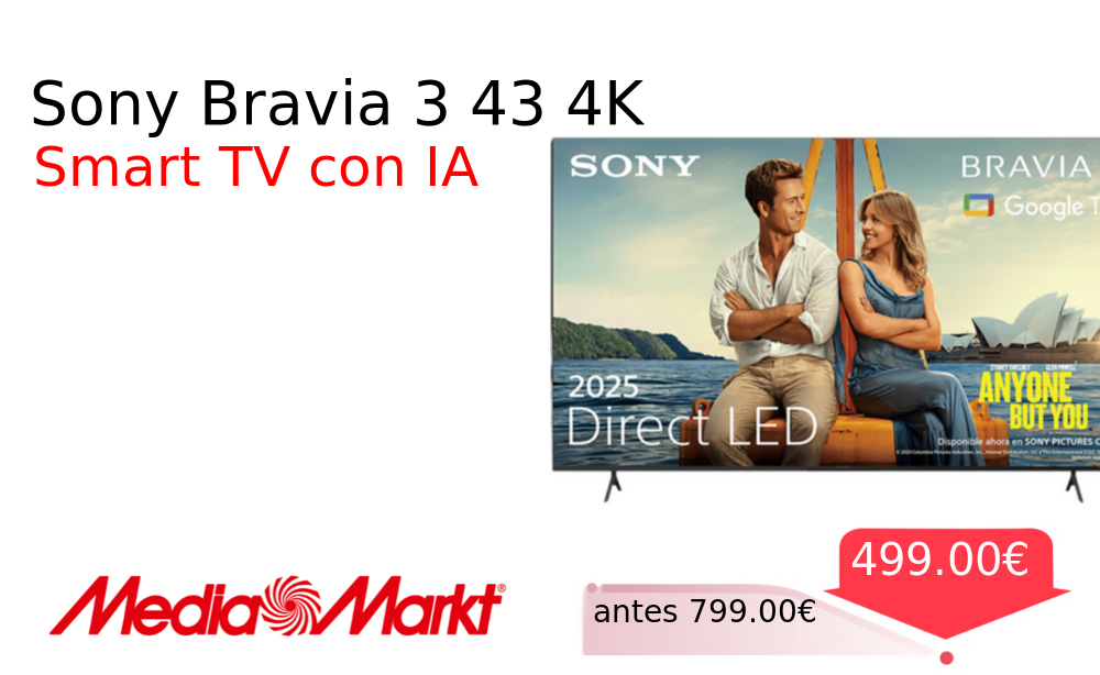 Más de un 30% 🚀 Sony Bravia 3 43 4K❗️🆕 #MediaMarkt 📛Precio Ya 499.00€❗️ (PVP: +799.00€) ✨Televisor Sony Bravia 3 con pantalla LED de 43 pulgadas y resolución 4K Procesador X1 con IA para imágenes HDR y sonido Dolby Atmos. cholloya.com/SONY_BRAVIA3_43