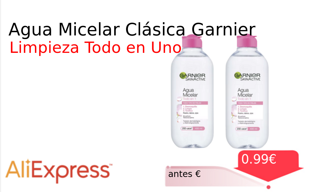 Buen Precio✨ Agua Micelar Clásica Garnier❗️🆕 #AliExpress 📛Precio Ya 0.99€❗️ (PVP: +€) ✨Agua micelar clásica de Garnier para pieles normales Limpia desmaquilla e hidrata en un solo gesto suave respetando la barrera natural de la piel. cholloya.com/GARNIER_MICELAR