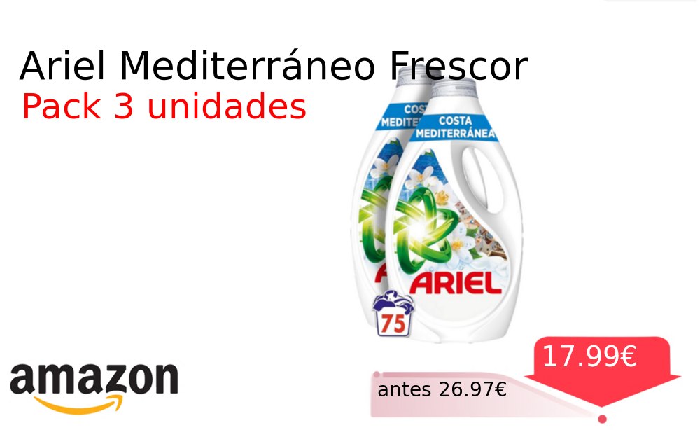 Más de un 30% 🚀 Ariel Mediterráneo Frescor❗️🆕 #Amazon 🇪🇸 📛Precio Ya 17.99€❗️ (PVP: +26.97€) ✨Detergente líquido con fragancias mediterráneas de brisa marina y jazmín Ofrece limpieza profunda y un frescor duradero Lenor en cada lavado para tu ropa. cholloya.com/ARIEL_MEDITERRA