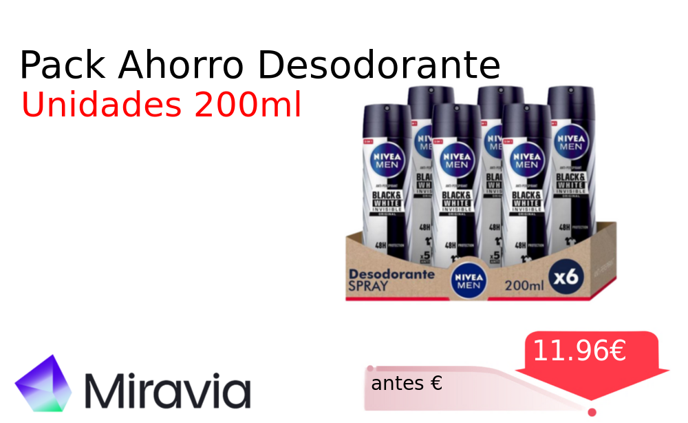 Buen Precio✨ Pack Ahorro Desodorante❗️🆕 #Miravia 📛Precio Ya 11.96€❗️ (PVP: +€) ✨Pack ahorro de seis desodorantes spray invisible para hombre Protección eficaz y frescura duradera sin dejar marcas blancas en la ropa Ideal para el. cholloya.com/NIVEA_MEN_PACK_