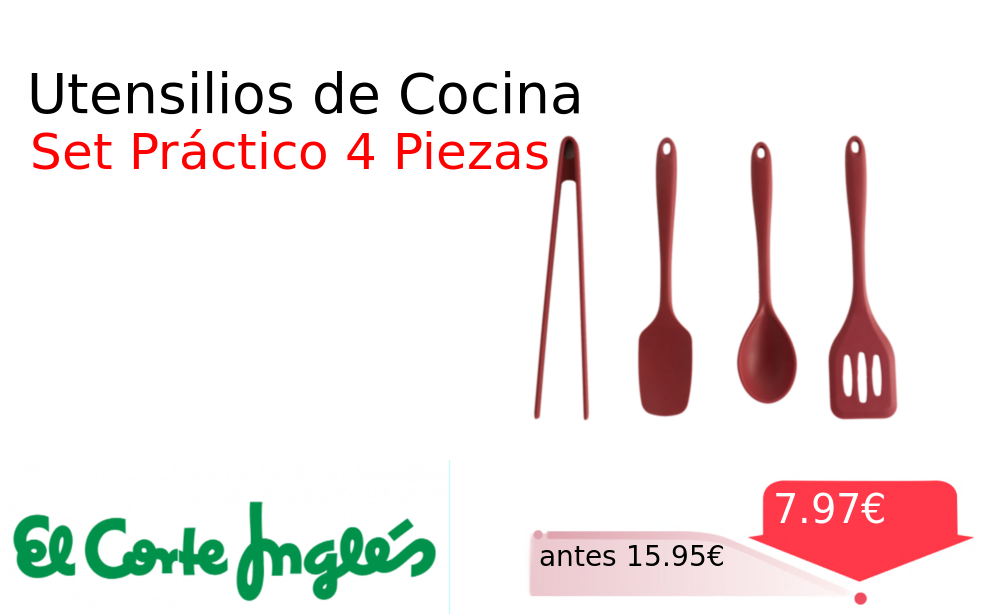 Mitad de precio✂️ Utensilios de Cocina❗️🆕 #Elcorteingles 📛Precio Ya 7.97€❗️ (PVP: +15.95€) ✨Set de cuatro utensilios esenciales de silicona para cocinar y servir con facilidad Incluye pinzas cuchara y dos espátulas resistentes y seguros para todo. cholloya.com/SET_SILICONA_4P