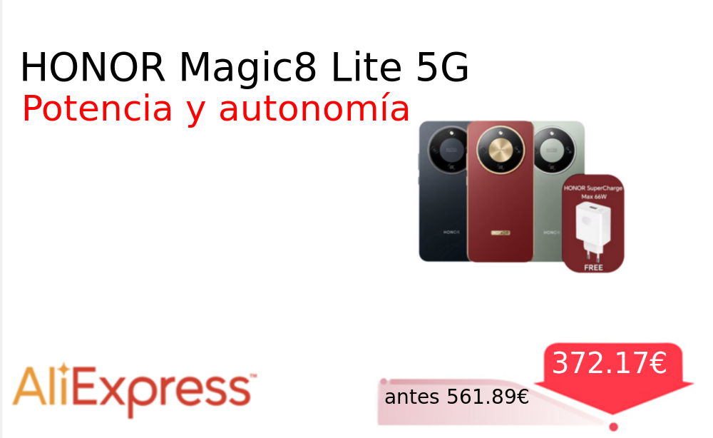 Más de un 30% 🚀 HONOR Magic8 Lite 5G❗️🆕 #AliExpress 📛Precio Ya 372.17€❗️ (PVP: +561.89€) ✨Smartphone 5G con pantalla AMOLED de 6 79 pulgadas y 120Hz Batería de larga duración y cámara principal de 108MP para fotos nítidas. cholloya.com/HONOR_MAGIC8_LI