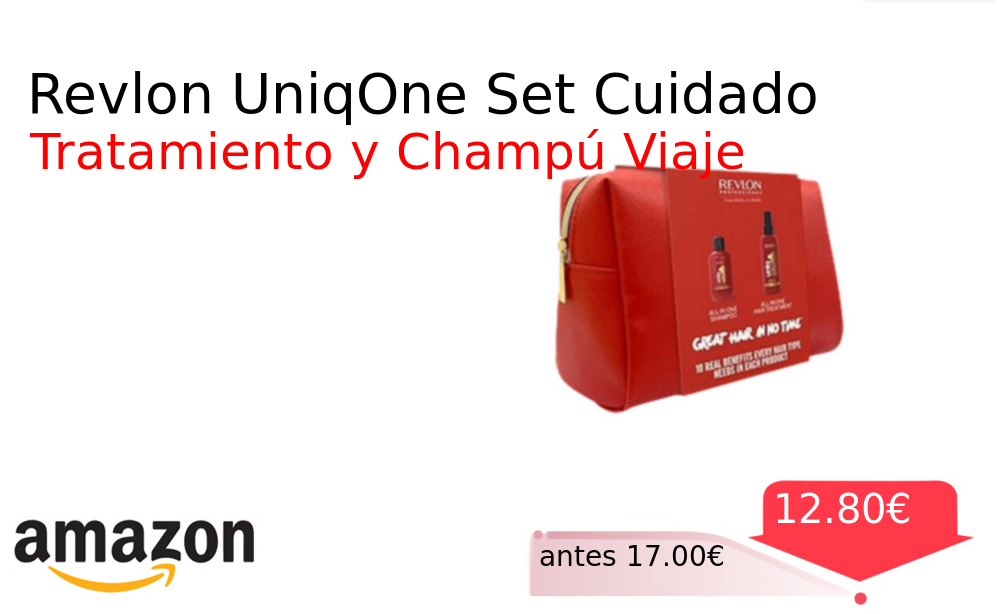 Buen Precio✨ Revlon UniqOne Set Cuidado❗️🆕 #Amazon 🇪🇸 📛Precio Ya 12.80€❗️ (PVP: +17.00€) ✨Tratamiento sin aclarado en spray que protege del calor y controla el frizz Incluye un champú de viaje y un neceser para un cuidado. cholloya.com/revlon_uniqone_set
