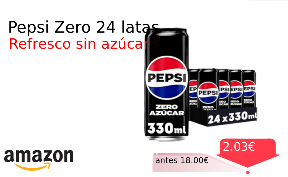 Mitad de precio✂️ Pepsi Zero 24 latas❗️🆕 #Amazon 🇪🇸 📛Precio Ya 2.03€❗️ (PVP: +18.00€) ✨Refrescante cola con sabor clásico sin azúcar y cero calorías Pack de veinticuatro latas de aluminio ideal para compartir con diseno innovador y funcional. cholloya.com/pepsi_zero_24latas