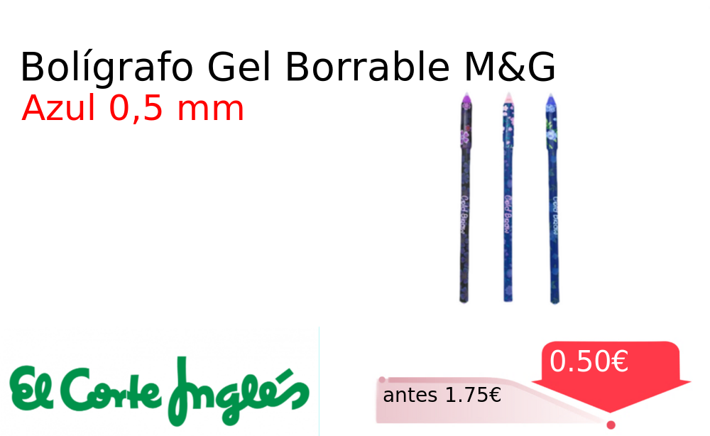 Mitad de precio✂️ Bolígrafo Gel Borrable M&G❗️🆕 #Elcorteingles 📛Precio Ya 0.50€❗️ (PVP: +1.75€) ✨Bolígrafo de gel con punta fina de 0 5 mm Su tinta azul se borra con facilidad ideal para tomar notas y hacer correcciones. cholloya.com/boligrafo_gel_mg
