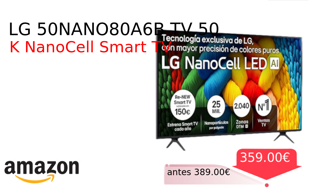 Buen Precio✨ LG 50NANO80A6B TV 50❗️🆕 #Amazon 🇪🇸 📛Precio Ya 359.00€❗️ (PVP: +389.00€) ✨Televisor 4K NanoCell de 50 pulgadas con procesador IA para un color realista Smart TV WebOS 25 compatibilidad con asistentes de voz y sonido. cholloya.com/lg_50nano80a6b
