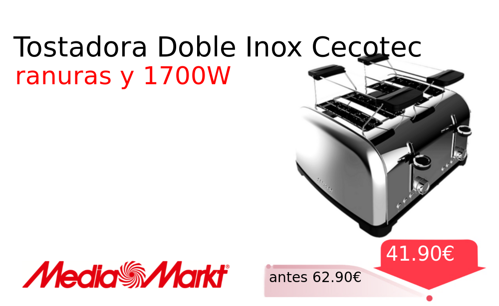 Más de un 30% 🚀 Tostadora Doble Inox Cecotec❗️🆕 #MediaMarkt 📛Precio Ya 41.90€❗️ (PVP: +62.90€) ✨Tostadora de cuatro ranuras con 1700 W y siete niveles de tostado Incluye función para calentar panecillos y diseño en acero inoxidable para un. cholloya.com/CECOTEC_TOASTIN