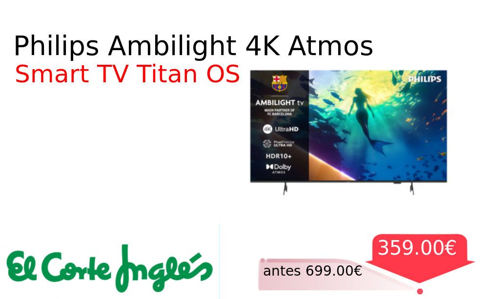 40% 📉 Vaya descuentazo‼‼ Philips Ambilight 4K Atmos❗️🆕 #Elcorteingles 📛Precio Ya 359.00€❗️ (PVP: +699.00€) ✨Televisor LED con tecnología Ambilight que crea una experiencia visual envolvente Resolución Ultra HD 4K para imágenes nítidas y sistema de sonido Dolby Atmos. cholloya.com/PHILIPS_55PUS80