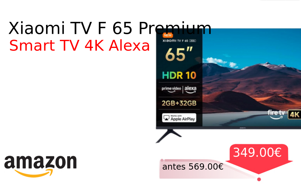 Más de un 30% 🚀 Xiaomi TV F 65 Premium❗️🆕 #Amazon 🇪🇸 📛Precio Ya 349.00€❗️ (PVP: +569.00€) ✨Televisor inteligente de 65 pulgadas con resolución 4K UHD compatibilidad Alexa y tecnología HDR10 Incluye modo juego optimizado y amplio almacenamiento integrado. cholloya.com/XIAOMI_TV_F65
