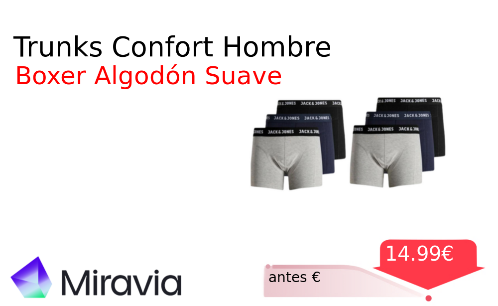 Buen Precio✨ Trunks Confort Hombre❗️🆕 #Miravia 📛Precio Ya 14.99€❗️ (PVP: +€) ✨Boxer hombre con cintura elástica fabricados en tejido transpirable de algodón Ideales para uso diario ofrecen comodidad y ajuste perfecto durante todas las temporadas. cholloya.com/JACK_JONES_TRUN