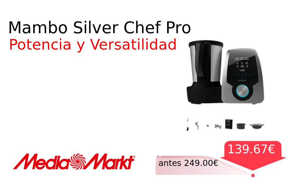 40% 📉 Vaya descuentazo‼‼ Mambo Silver Chef Pro❗️🆕 #MediaMarkt 📛Precio Ya 139.67€❗️ (PVP: +249.00€) ✨Robot multifunción con 23 programas integrados Potencia 1700 W jarra 3 3 litros pantalla digital y temporizador Diez velocidades para máxima precisión culinaria. cholloya.com/CECOTEC_MAMBO_S