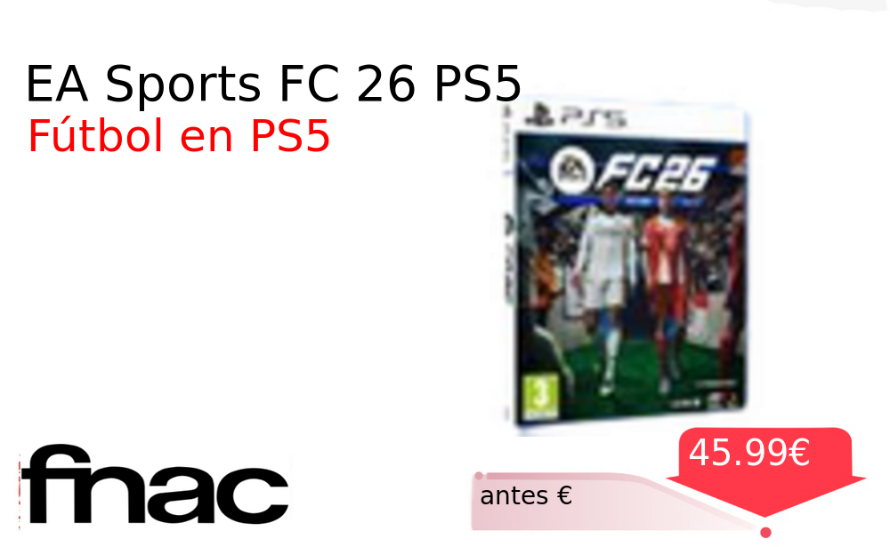 Buen Precio✨ EA Sports FC 26 PS5❗️🆕 #fnac 📛Precio Ya 45.99€❗️ (PVP: +€) ✨Vive la emoción del fútbol con gráficos mejorados y jugabilidad realista en PlayStation 5 Experiencia definitiva para aficionados con diseno innovador y funcional. cholloya.com/EA_FC26_PS5