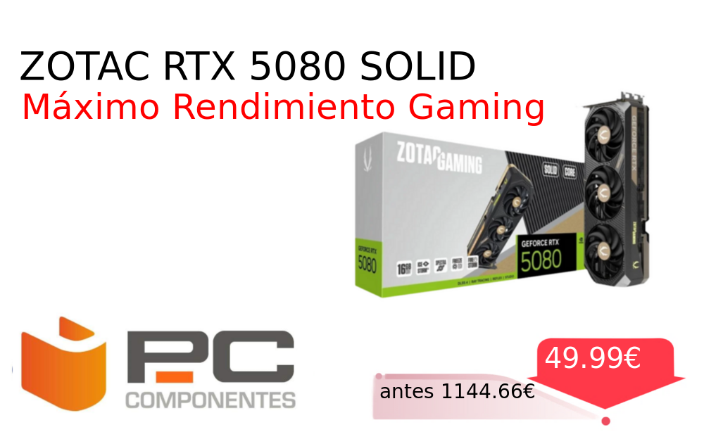 Mitad de precio✂️ ZOTAC RTX 5080 SOLID❗️🆕 #PcComponentes 📛Precio Ya 49.99€❗️ (PVP: +1144.66€) ✨Potencia gráfica extrema con tecnología RTX AI y DLSS4 avanzado Rendimiento excepcional para gaming en 4K y creación de contenido profesional con 16GB GDDR7. cholloya.com/ZOTAC_RTX5080_S