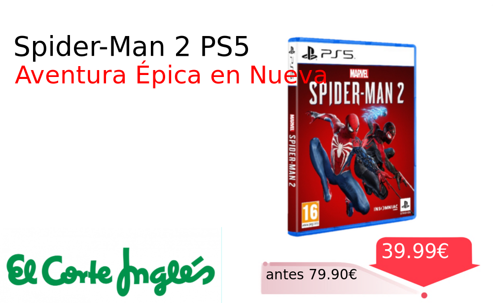 40% 📉 Vaya descuentazo‼‼ Spider-Man 2 PS5❗️🆕 #Elcorteingles 📛Precio Ya 39.99€❗️ (PVP: +79.90€) ✨Vive la épica aventura del Hombre Araña en PS5 Juega como Peter y Miles enfrentando nuevos y peligrosos villanos en una Nueva York ampliada. cholloya.com/SPIDERMAN2_PS5