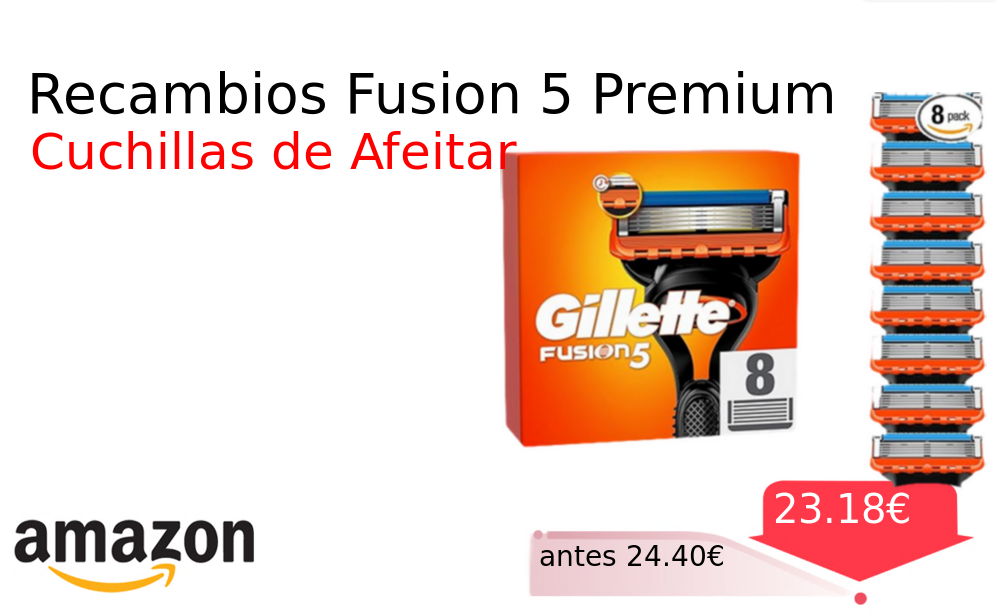 Buen Precio✨ Recambios Fusion 5 Premium❗️🆕 #Amazon 🇪🇸 📛Precio Ya 23.18€❗️ (PVP: +24.40€) ✨Recambios de ocho cuchillas de afeitar con cinco hojas para un corte preciso y suave Tecnología avanzada para una piel confortable tras cada uso. cholloya.com/GILLETTE_FUSION