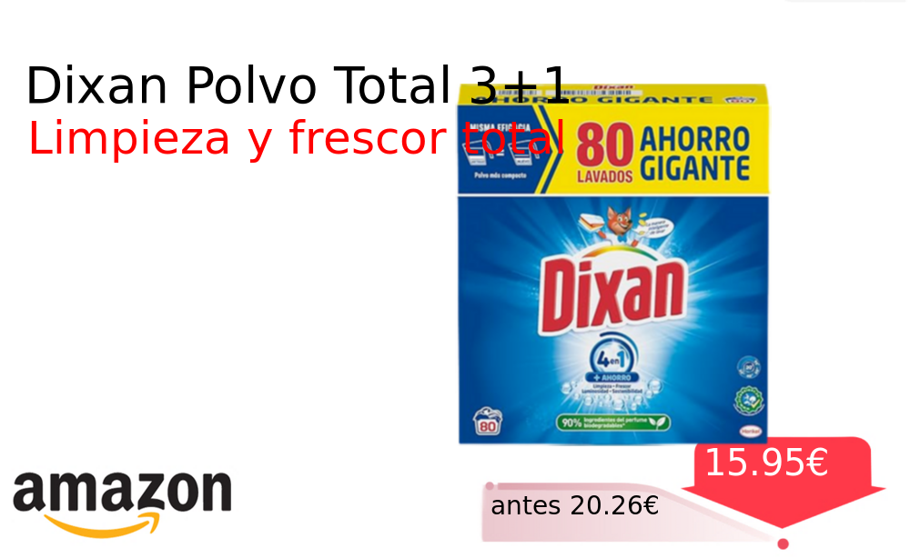 Buen Precio✨ Dixan Polvo Total 3+1❗️🆕 #Amazon 🇪🇸 📛Precio Ya 15.95€❗️ (PVP: +20.26€) ✨Detergente en polvo para lavadora con fórmula avanzada Proporciona limpieza profunda luminosidad y frescor duradero para toda la ropa blanca o de color. cholloya.com/DIXAN_POLVO_TOT
