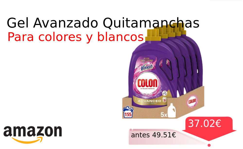 Buen Precio✨ Gel Avanzado Quitamanchas❗️🆕 #Amazon 🇪🇸 📛Precio Ya 37.02€❗️ (PVP: +49.51€) ✨Gel quitamanchas avanzado para lavadora Eficaz en ropa blanca y de color con fórmula concentrada de calidad premium Resultados visibles y protección de tejidos. cholloya.com/COLON_VANISH_GE