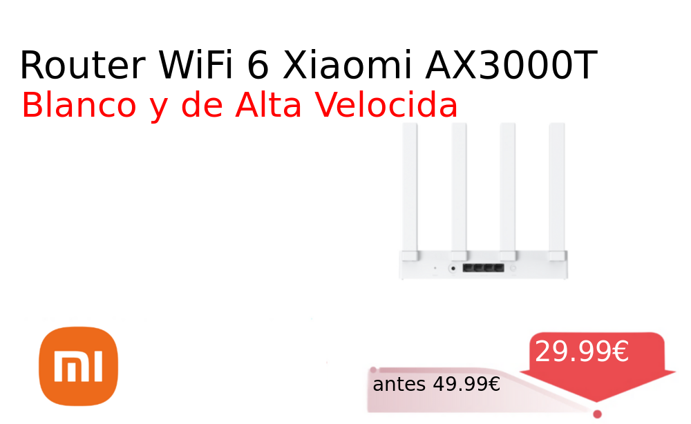 40% 📉 Vaya descuentazo‼‼ Router WiFi 6 Xiaomi AX3000T❗️🆕 #Mi 📛Precio Ya 29.99€❗️ (PVP: +49.99€) ✨Router WiFi 6 de Xiaomi con conectividad dual banda y alta velocidad Diseño compacto en color blanco para un rendimiento estable y cobertura amplia. cholloya.com/XIAOMI_AX3000T