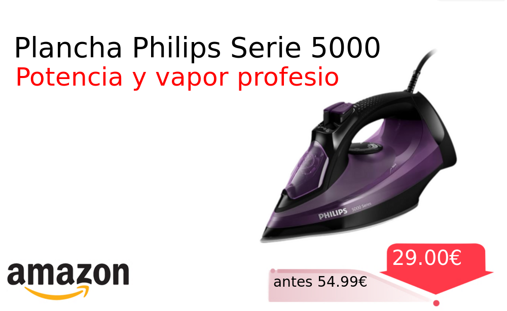 40% 📉 Vaya descuentazo‼‼ Plancha Philips Serie 5000❗️🆕 #Amazon 🇪🇸 📛Precio Ya 29.00€❗️ (PVP: +54.99€) ✨Plancha de vapor de alta potencia con suela avanzada SteamGlide Plus Ofrece un potente golpe de vapor y función vertical para eliminar arrugas. cholloya.com/PHILIPS_DST5030