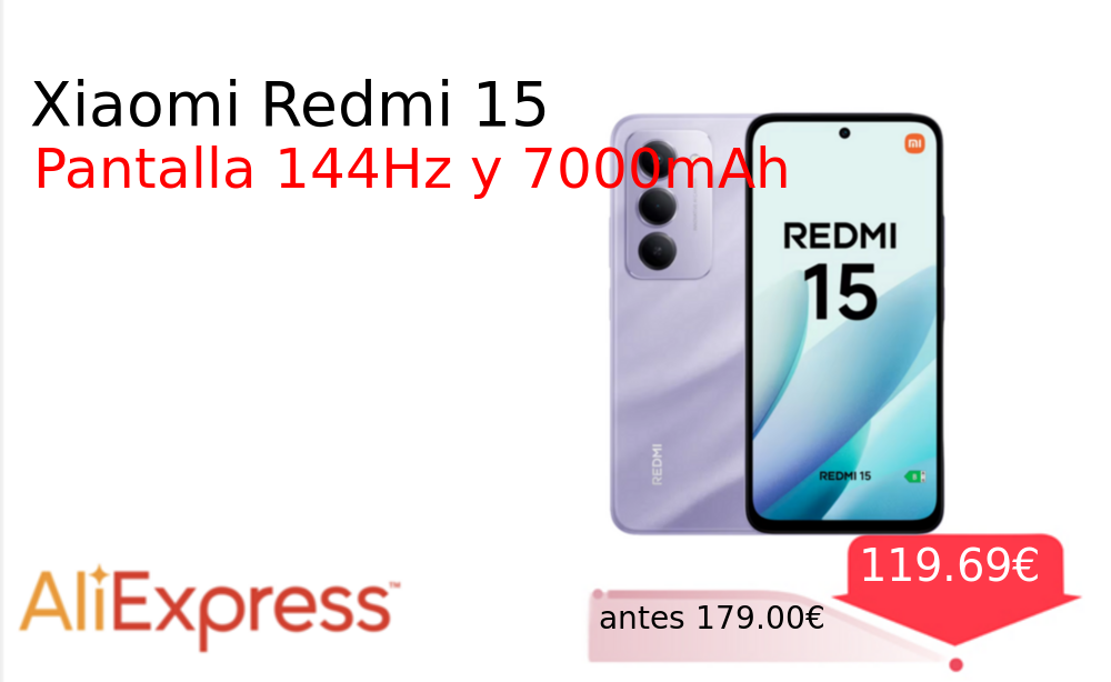 Más de un 30% 🚀 Xiaomi Redmi 15❗️🆕 #AliExpress 📛Precio Ya 119.69€❗️ (PVP: +179.00€) ✨Smartphone con pantalla FHD de 6 9 pulgadas y 144 Hz Procesador Snapdragon 685 cámara dual de 50 MP y batería de 7000 mAh. cholloya.com/XIAOMI_REDMI_15