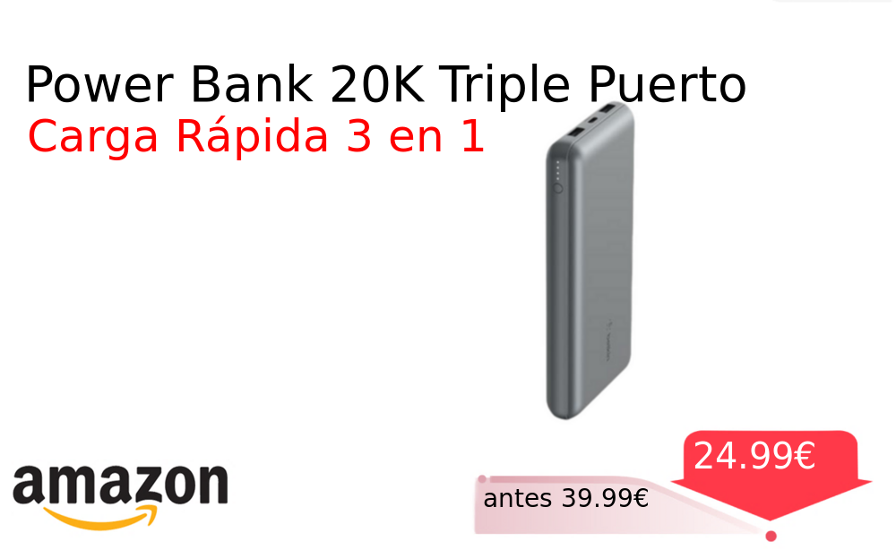 Más de un 30% 🚀 Power Bank 20K Triple Puerto❗️🆕 #Amazon 🇪🇸 📛Precio Ya 24.99€❗️ (PVP: +39.99€) ✨Batería externa de 20000mAh con tres puertos para carga simultánea Incluye cable y ofrece carga rápida para iPhone Galaxy iPad y otros dispositivos móviles. cholloya.com/BATERIA_20000MA