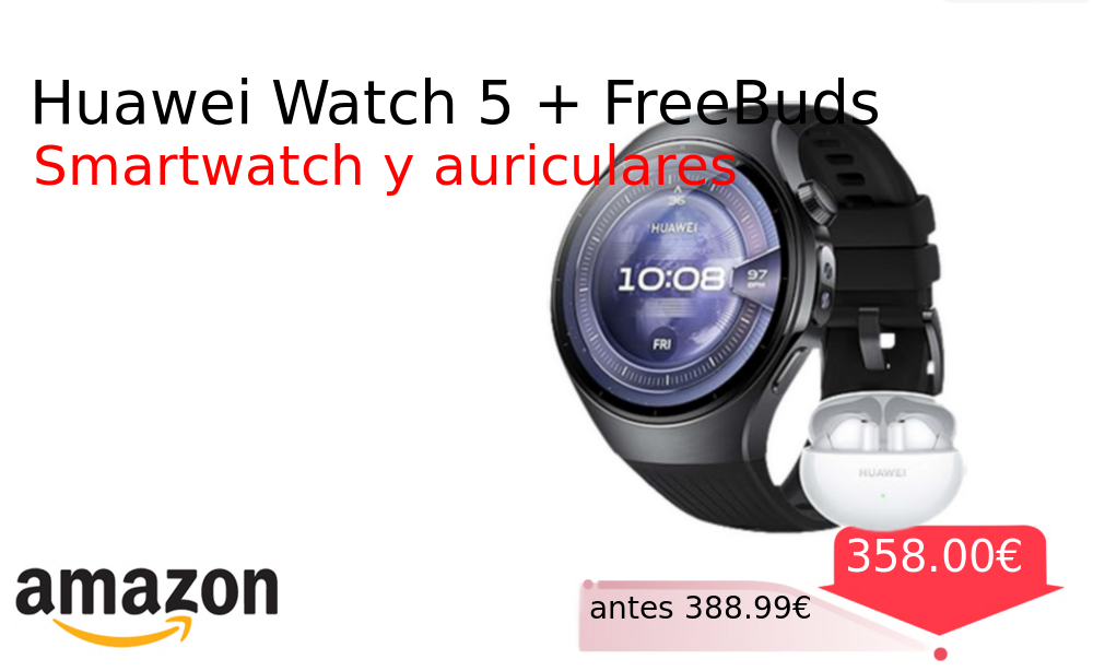 Buen Precio✨ Huawei Watch 5 + FreeBuds❗️🆕 #Amazon 🇪🇸 📛Precio Ya 358.00€❗️ (PVP: +388.99€) ✨Smartwatch con eSIM y monitorización avanzada de salud incluyendo ECG y SpO2 Incluye auriculares inalámbricos FreeBuds 6i en color blanco. cholloya.com/HUAWEI_WATCH5_F