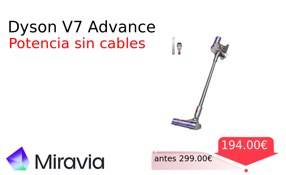 Más de un 30% 🚀 Dyson V7 Advance❗️🆕 #Miravia 📛Precio Ya 194.00€❗️ (PVP: +299.00€) ✨Aspiradora sin cable compacta y potente para todo tipo de suelos Tecnología Dyson con gran autonomía y accesorios versátiles para una limpieza profunda. cholloya.com/DYSON_V7_ADVANC