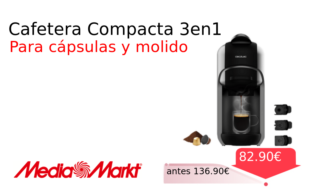 Más de un 30% 🚀 Cafetera Compacta 3en1❗️🆕 #MediaMarkt 📛Precio Ya 82.90€❗️ (PVP: +136.90€) ✨Cafetera compacta 3 en 1 para cápsulas Dolce Gusto Nespresso y café molido Presión de 19 bar para un espresso perfecto Diseño plateado. cholloya.com/CECOTEC_FREESTY