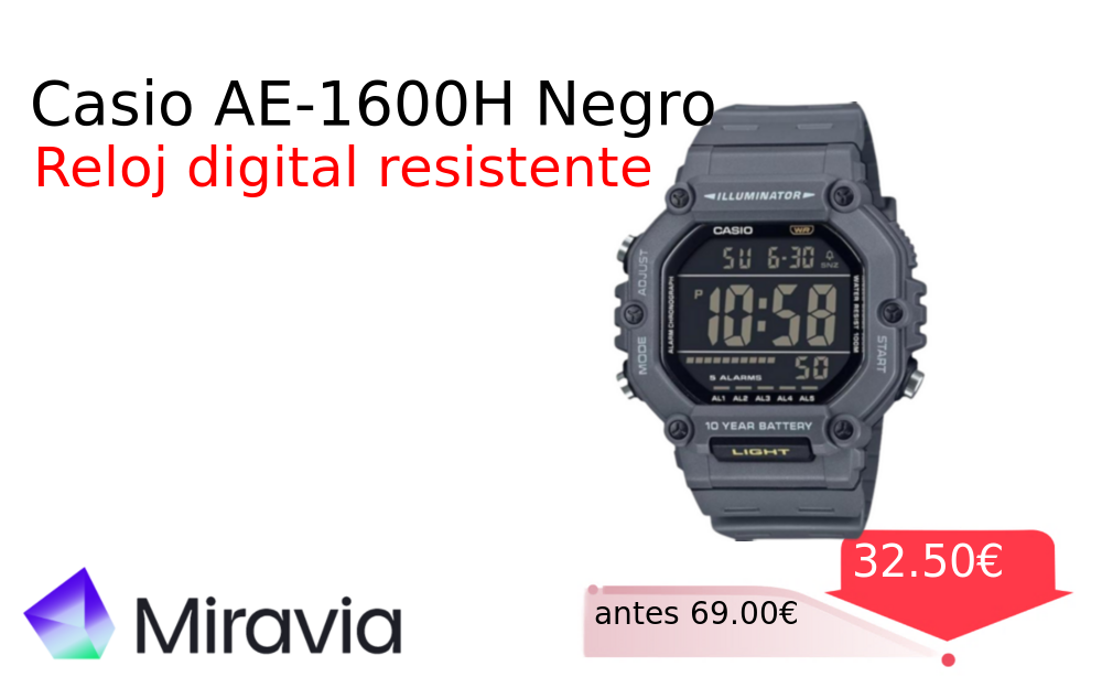 Mitad de precio✂️ Casio AE-1600H Negro❗️🆕 #Miravia 📛Precio Ya 32.50€❗️ (PVP: +69.00€) ✨Reloj digital Casio para hombre con diseño clásico y funcionalidad moderna Resistente al agua incluye alarma y cronómetro Ideal para el día a día. cholloya.com/CASIO_AE1600H_N
