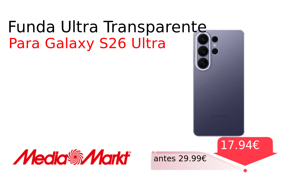 40% 📉 Vaya descuentazo‼‼ Funda Ultra Transparente❗️🆕 #MediaMarkt 📛Precio Ya 17.94€❗️ (PVP: +29.99€) ✨Funda transparente de ajuste optimizado para el Galaxy S26 Ultra Ofrece protección premium respetando el diseño original y garantizando acceso total a todos los. cholloya.com/SAMSUNG_S26_ULT