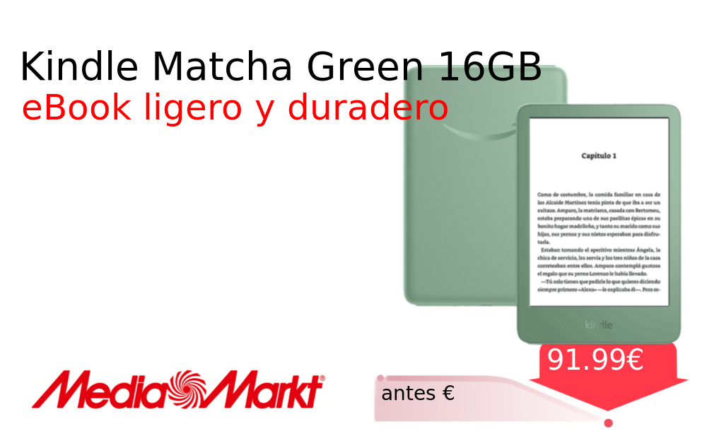 Buen Precio✨ Kindle Matcha Green 16GB❗️🆕 #MediaMarkt 📛Precio Ya 91.99€❗️ (PVP: +€) ✨Disfruta de una lectura nítida con pantalla HD de 6 pulgadas Gran autonomía de hasta ocho semanas y amplio almacenamiento para miles de libros. cholloya.com/KINDLE_MATCHA_G