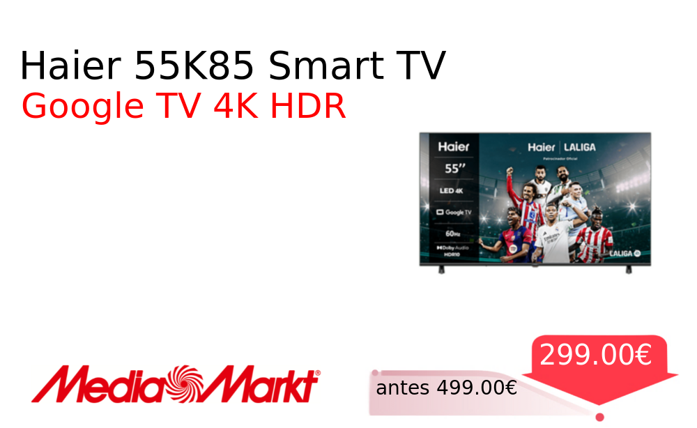 40% 📉 Vaya descuentazo‼‼ Haier 55K85 Smart TV❗️🆕 #MediaMarkt 📛Precio Ya 299.00€❗️ (PVP: +499.00€) ✨Televisor LED 55 pulgadas con diseño sin marcos y pantalla 4K HDR Smart TV con Google TV integrado y asistente de voz Sonido Dolby. cholloya.com/HAIER_H55K85FUX