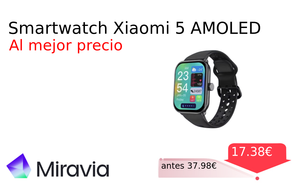 Mitad de precio✂️ Smartwatch Xiaomi 5 AMOLED❗️🆕 #Miravia 📛Precio Ya 17.38€❗️ (PVP: +37.98€) ✨Reloj inteligente unisex con pantalla AMOLED HD Monitoriza frecuencia cardíaca y actividad física Resistente al agua con múltiples modos deportivos Permite realizar llamadas mediante. cholloya.com/XIAOMI5SM