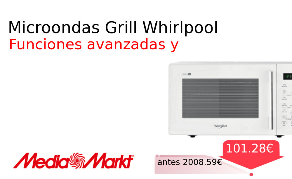 Mitad de precio✂️ Microondas Grill Whirlpool❗️🆕 #MediaMarkt 📛Precio Ya 101.28€❗️ (PVP: +2008.59€) ✨Microondas con grill Whirlpool blanco de 25 litros y 1000W potencia Siete niveles de cocción y programas automáticos Producto reacondicionado con garantía completa. cholloya.com/WHIRLPOOL_MWP25