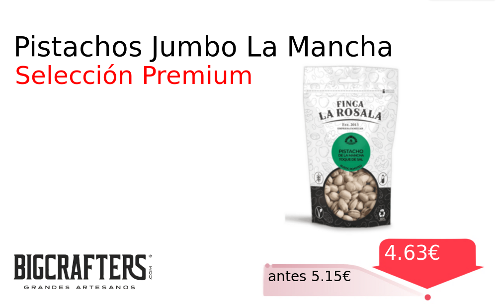 ¡Toma descuento!🤯 Pistachos Jumbo La Mancha❗️🆕 #BigCrafters 📛Precio Ya 4.63€❗️ (PVP: +5.15€) ✨Pistachos jumbo cultivados en Finca La Rosala selección premium de La Mancha Gran tamaño y sabor intenso perfectos para picar entre horas o como. cholloya.com/PISTACHOS_JUMBO