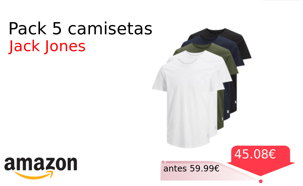 Precio de derribo🏗️ Pack 5 camisetas❗️🆕 #Amazon 🇪🇸 📛Precio Ya 45.08€❗️ (PVP: +59.99€) ✨Renueva tus camisetas básicas con este lote de camisetas de Jack & Jones. Con un acabado inferior redondeado y la máxima calidad de algodón. cholloya.com/PACK5JACK
