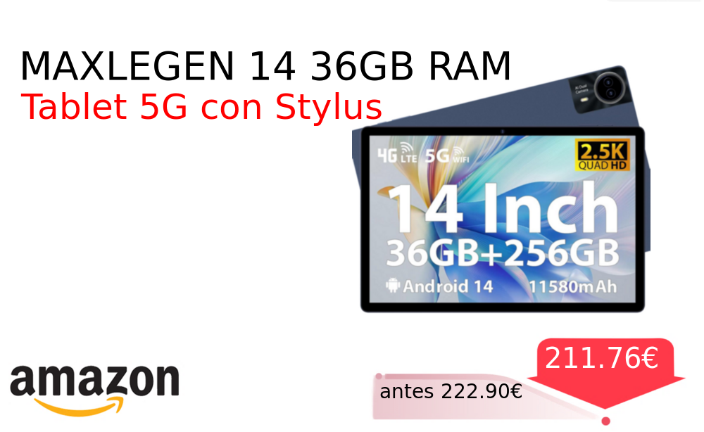 Buen Precio✨ MAXLEGEN 14 36GB RAM❗️🆕 #Amazon 🇪🇸 📛Precio Ya 211.76€❗️ (PVP: +222.90€) ✨Tablet de 14 pulgadas con pantalla 2 5K 36GB RAM y almacenamiento ampliable Incluye conectividad 5G batería de larga duración cuatro altavoces y Android. cholloya.com/TABLET_MAXLEGEN