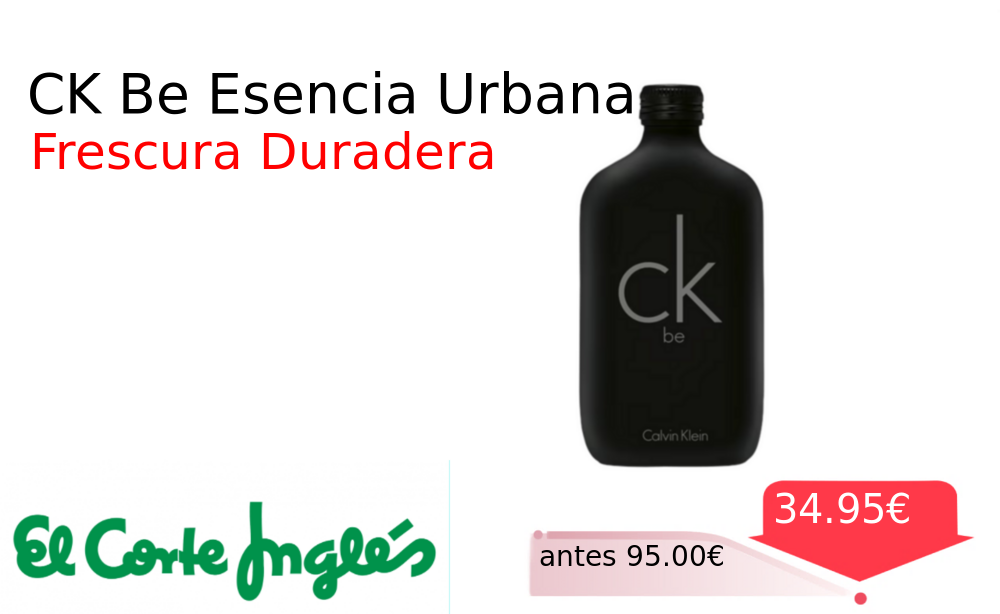 Mitad de precio✂️ CK Be Esencia Urbana❗️🆕 #Elcorteingles 📛Precio Ya 34.95€❗️ (PVP: +95.00€) ✨Fragancia unisex de carácter urbano y moderno Notas frescas que perduran con elegancia en tu piel durante todo el día. cholloya.com/CK_BE_200ML