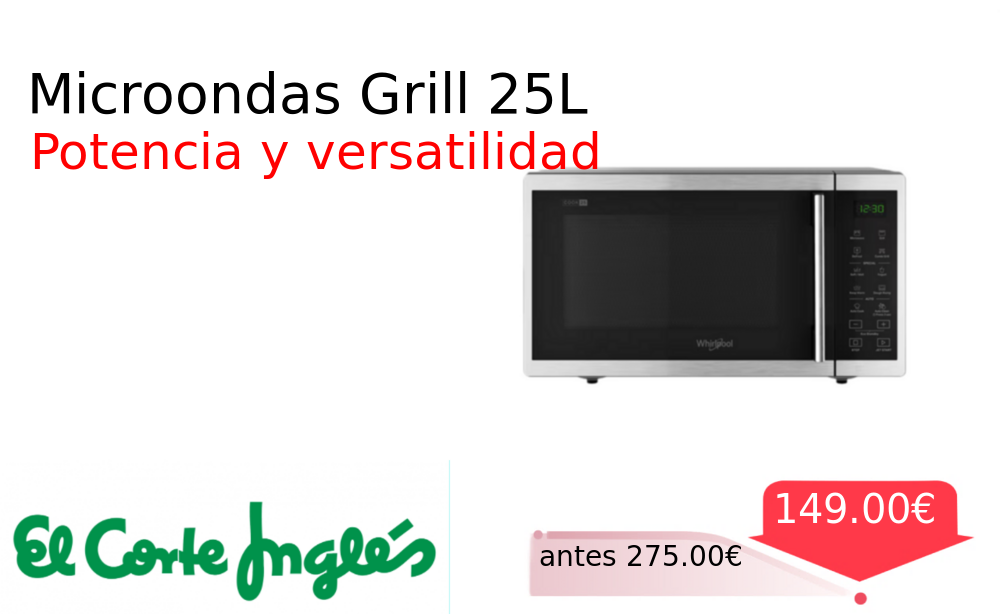 40% 📉 Vaya descuentazo‼‼ Microondas Grill 25L❗️🆕 #Elcorteingles 📛Precio Ya 149.00€❗️ (PVP: +275.00€) ✨Microondas Whirlpool con función grill y capacidad de veinticinco litros Tecnología avanzada para cocinar y calentar con resultados profesionales en tu hogar. cholloya.com/WHIRLPOOL_MWP25