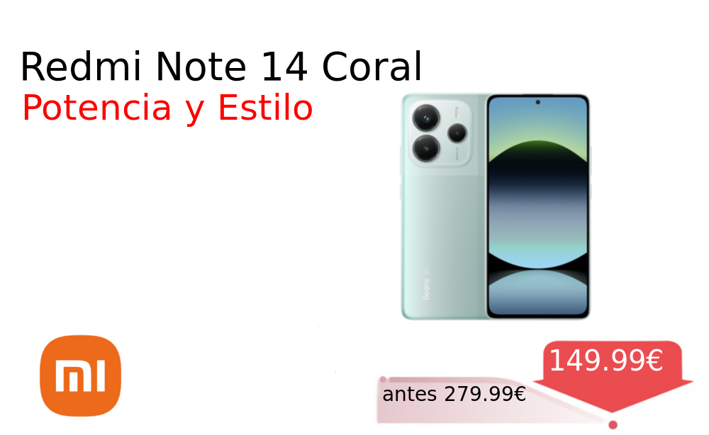40% 📉 Vaya descuentazo‼‼ Redmi Note 14 Coral❗️🆕 #Mi 📛Precio Ya 149.99€❗️ (PVP: +279.99€) ✨Smartphone con conectividad 5G y memoria amplia en color verde coral Tecnología avanzada integrada en un diseño moderno y sofisticado para uso diario. cholloya.com/REDMI_NOTE_14